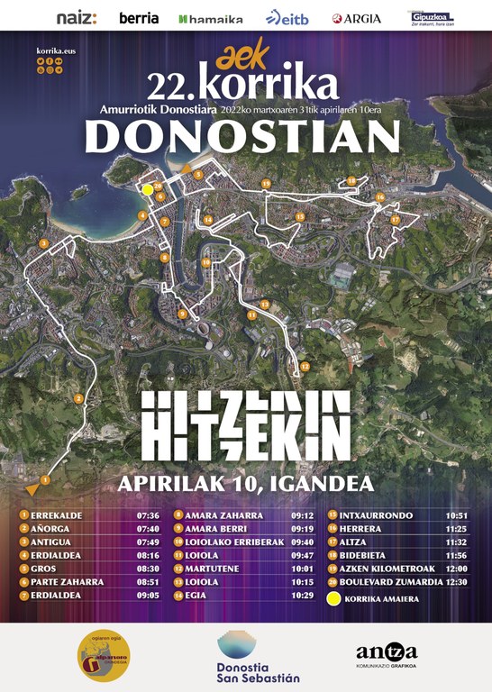 Donostiako Boulevard Zumardian bukatuko da igandean KORRIKAren 22. edizio honen 2.500 kilometroko ibilbidea. Gipuzkoako hiriburu osoa zeharkatu ondoren, Zurriola hiribidetik sartuko da karabana koloretsua. Amaiera ekitaldia Boulevardean egingo dute, eta, jarraian, festarako garaia izango da. Euskal Herriko txoko guztietako jendea bertaratzeko deia egin dute Korrika arduradunek, eta Donostiako herritarrentzat nahiz eragileentzat "hitzordu ederra" izango dela ere adierazi dute, "euskararen auzian lanean segitzeko akuilua".