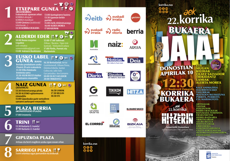 Hainbat ekintza izango dira egunean zehar hiriko hainbat puntutan. Bulebarrean egongo den Etxepare gunean Egunean Behin partida jokatuko da, eta musikarik ez da faltako Zutik elektrotxaranga, Alarma Morea eta Kilimak taldeen eskutik. Alderdi Ederren umeentzako ikuskizunak eta tailerrak izango dira, eta Pirritx, Porrotx eta Marimototsen emanaldia. Kaian bertako produktuen azoka eta Piratek 20 urte erakusketaz gain, EHko Batukada feminista sarearen eta Axuri Beltza Kultur elkartearen emanaldiak izango dira. Bertsolarien saioa eta Olatz Salvador eta Trikidantz-en kontzertuak ere egingo dituzte kaian. Zuloagan Gipuzkoako gazte sortzaileen sarearen aurkezpen-emanaldia egingo dute, eta Lamiak, Mugan eta ETS taldeen musika emanaldiak ere izango dira. Konstituzio plazan erromeria izango da, Trinitate plazan herri bazkaria, Gipuzkoa plazan artisau eta herri eragileen azoka, eta Sarriegi plazan jatekoa prestatuko dute, txerri sekretua sagar purearekin eta kroketak.