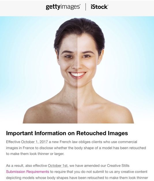 Getty Images, munduko irudi banku handienak, modeloetan Photoshop erabiltzea debekatu dio. Urriaren 1ean hartu zuten erabakia... Frantziako Osasun Publikoaren Kodean atxikitako lege berriarekin bat eginez. Hain zuzen, argazki agentziak araudi berria onartu du, eta aurrerantzean, giza gorputz errealak eta moldatu gabeak irudikatzeko konpromisoa hartu du.