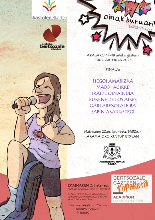 Azkenik, bihar, larunbata, jokatuko da Arabako bertsolari gaztetxoen Eskolarteko XXVIII. finala, Aramaioko Kultur Etxean, 19:30ean. Kantatuko duten bertsolariak hauek izango dira: Aramaioko Iraide Oinaindia, Sabin Abarrategi eta Gari Arexolaleiba; eta Gasteizko Eukene de los Aires, Maddi Agirre eta Hegoi Amabizka. Lehen bi postuak lortzen dituzten bertsolariak Euskal Herriko eskolarteko txapelketan arituko diren bi arabarrak izango dira.