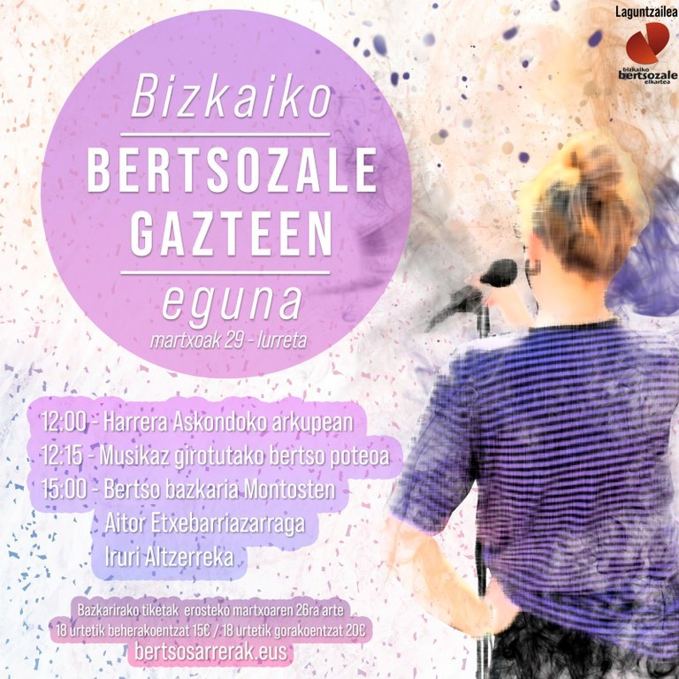 Bizkaiko bertsozale gazteen eguna antolatu dute, lehen aldiz, eta bihar izango da, Iurretan. Bizkaiko bertsozale gazteek elkar ezagutzeko edota euren harremanak sendotzeko helburuz sortu da. Askondoko arkupean elkartuko dira eguerdiko hamabietan, eta poteo musikatua egingo dute herrian zehar. Montoste elkartean bazkalduko dute eta bertan Aitor Etxebarriazarraga eta Iruri Altzerreka arituko dira bertsotan.