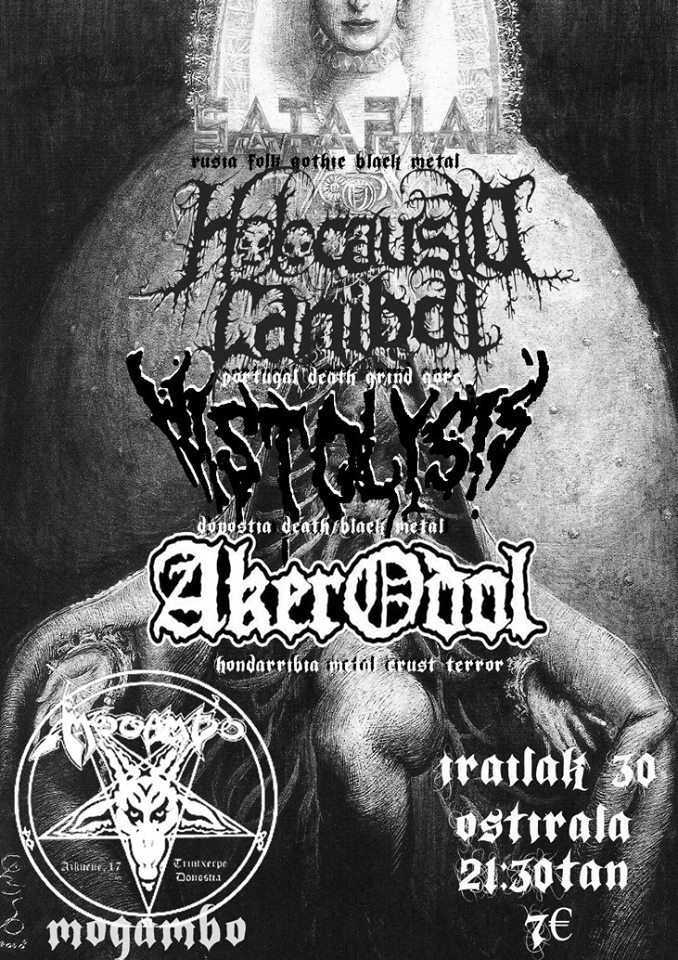 Ostiralean, 21:30etik aurrera, Musika beltzeta gotikoaz emango diote amaiera udari Mogambon: Satarial (Errusiako BlackGothic Folk Metala) Holocausto Canibal (Portugalgo Gore Grind Death), Histolysis (Donostiako Death/Black) eta AkerOdol (Hondarribiako Metal Crust Terror). Larunbatean berriz, Heavy Metalaizango da nagusi, Madrilgo Nightfear eta Bizkaiko Taken taldeekin.
