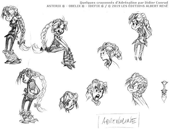 Asterixen abenturetan lehenengoz neska nerabe bat izango da protagonista. Abentura honetan azalduko den gaztea altua eta argala da, motots gorri luzea du eta begirada tinkoa. Adrenaline deituko da eta zenbakiko azalean azaltzen da, Asterix, Obelix eta Idefix, betiko pertsonaiekin batera.