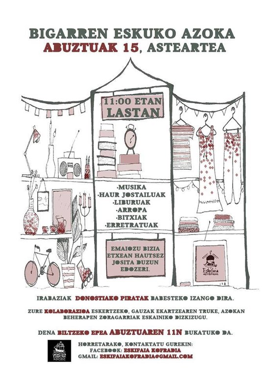 Hilaren 14ean eztanda egingo du Donostiako Aste Nagusiak, eta Piratak lanean ari dira, mota guztietako entretenimendua eskaintzeko prestaketetan murgilduta. Aurtengo berritasunen artena, Aste Nagusian bigarren eskuko azoka egingo du Eskifaia kofradiak. Hain zuzen ere, hilaren 15ean egingo dute Lastan goizeko 11etan. “Hartu eta emanari ekin eta eman bizia etxean hautsez josita duzun edozeri!”, adierazi dute kofradiako kideek. Gauzak ematearen truke deskontuak eskainiko dituzte.