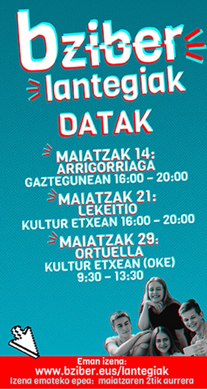 Azkue Fundazioak sustatutako Bziber egitasmoak sare sozialei buruzko lantegiak prestatu ditu gaztetxoentzat maiatzean. Bizkaiko hiru lekutan izango dira: maiatzaren 14an, Arrigorriagako Gaztegunean; maiatzaren 21ean, Lekeitioko Kultur Etxean; eta maiatzaren 29an, Ortuellako Kultur Etxean.
