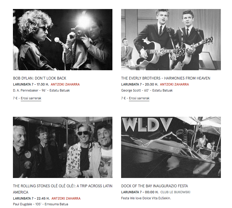 Lehiaketaz gain, bi atal antolatu ditu zinemaldiak. Batetik, Perfect Day sailak, nazioartean berriki egindako musika dokumentalak eskaintzen ditu, hala nola The Rolling Stones, Blur eta Thor taldeen inguruko zintak. Bestetik, Paint in Black atalak atzera begirako dokumental klasikoak eskaintzen ditu. Bertan, besteak beste, berriki hildako Leonard Cohenen bizitza gertutik ezagutzeko aukera eskainiko dute, Bird On A Wire dokumentalaren eskutik.
