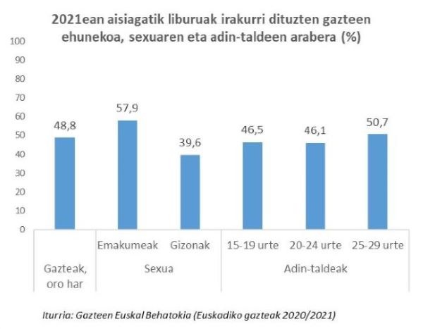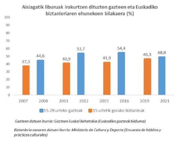 Eusko Jaurlaritzaren Gazteen Euskal Behatokiak emandako datuen arabera, Euskal Autonomi Erkidegoko 15 eta 29 urte bitarteko gazteen %48,8k adierazi du aurreko hilabetean libururen bat irakurri duela aisialdiagatik, hau da, ikasketekin eta lanbidearekin zerikusirik ez duena. Kopuru hori 2012an edo 2016an jasotakoak baino txikiagoa da, baina 2008koa baino handiagoa.