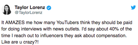 The Daily Beast, Daily Mail eta People aldizkarietako kazetari Taylor Lorenzek piztu du eztabaida Twitterren. Kazetaria, kexu da youtuber askok elkarrizketa bat eskaintzeagatik dirua eskatzen diotelako, eta zorotzat hartu ditu. Hau da berak aireratutako txioa: