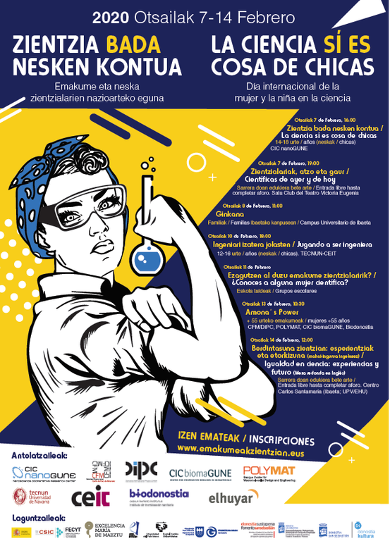 Donostian, Emakume Zientzialarien Nazioarteko Eguna dagoeneko martxan da, eta otsailaren 14ra bitartean ekintza ugari izango da. Bederatzi euskal erakunde (CIC nanoGUNE, Materialen Fisika Zentroa - CFM, CIC biomaGUNE, Donostia International Physics Center - DIPC, Biodonostia, Tecnun-Escuela de Ingenieros, Ceit, POLYMAT eta Elhuyar) elkartu dira 'Emakumeak Zientzian 2020' jarduera-programa zabala gauzatzeko. Ekimenaren helburua da zientzian diharduten emakumeen lana ikusaraztea, jarduera zientifiko-teknikoak gizonezkoen kontua direlako ustea apurtzea eta neskek eta nerabeek zientziako ikasketak hauta ditzaten sustatzea. Adin guztietako jendearentzako (familiak, nerabeak, helduak…) hainbat jarduera antolatu dira (tailerrak, hitzaldi publikoak, ginkana, bisitak, eta abar), eta Elhuyarrek parte hartze aktiboa du.