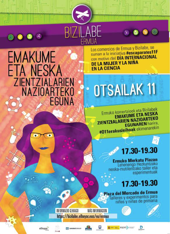 Otsailaren 11n, arratsaldez, emakume ikertzaileek gidatutako zientzia eta teknologia esperimentu eta tailerrak egingo dira Ermuako Merkatu Plazan, 6-12 urteko neska-mutilentzat. Ikertzaile profesional horien gidaritzapean, besteak beste, energia esperimentuak (propietate termodinamikoak, suzirien magia, dentsitatearen misterioa) edota teknologia-tailerrak (etxea garbitzeko mikrorobotak, alarma isil eta zaratatsuak) egingo dira. Doako ekimen hau 17.30etatik 19.30era bitarte egingo da.
