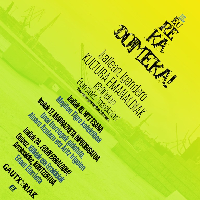 Gautxoriak elkarteak hirugarren Eureka Domeka! egingo du iraileko igandetan, aire zabalaz eta kulturgintzaz gozatseko asmotan. Erandioko malekoian, ibaiertzean, izango dira hiru saioak, eta euririk egingo balu, Gautxoriak alkartearen egoitzan egingo dira emanaldiak, 18:00etan hasita.