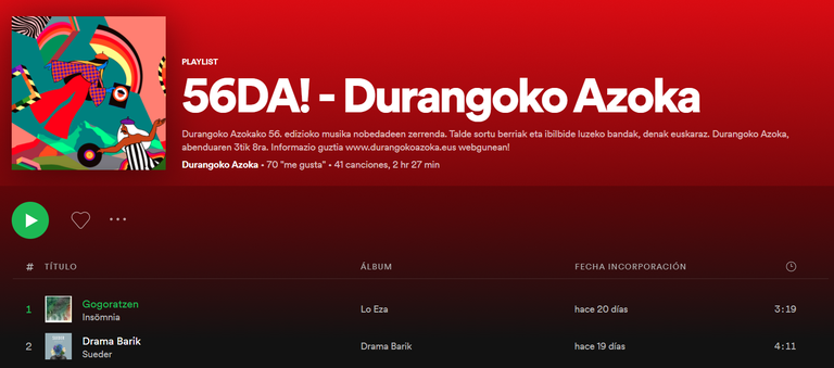 Hilabete falta da Durangoko Azokaren 56.ediziorako eta giroa pizten hasi da dagoeneko, Euskal Herriko musikagintzaren azken nobedadeak argitaratu baititu Spotify zerrendan. 42 abesti zintzilikatu dituzte oraingoz, baina astero eguneratuko dute zerrenda, euskal musikari eta taldeek euren azken nobedadeak Spotifyn argitaratzen dituzten heinean. Egileei dagokienez, ibilbide luzeko musikariak zein hasiberriak aurki daitezke bertan, eta abesti originalak zein bertsioak entzun daitezke.