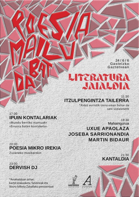Bestetik, Gabriel Arestiren Poesia mailu bat da lanean oinarritutako kartel erakusketa ere ipiniko dute, eta arratsalde osoan zehar bisitatu ahal izango da. Liburu eta fanzine bilketa ere egingo da arratsaldean zehar, Zaballan dauden presoentzako. Poesia mikro irekia antolatu dute, 20:00etan. Arestiren poema jarraituz egindako poemak errezitatzera gonbidatu dute jendea. Kantaldia egingo dute 21:30ean, eta Dervish-ek girotutako gaua izango da 23:00etatik aurrera.