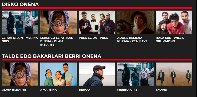 Zuzeneko onenaren kategorian, hauek dira bost hautagaiak: Dupla, IZARO, Chill Mafia, Neomak eta Gatibu. Bideoklip onenak ere jasoko du saria eta hauetako bat izango da: Zea Maysen Corazón de tango, Ezpalaken Kontran, HOFE X 4:40ren Handia, Huntzaren Odoletan eta Olatz Salvadorren Eraman nazazu.