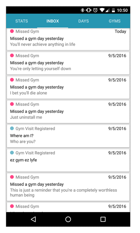 Abusive Gym Reminder izena du, eta gimnasiora bueltan eramango zaitu. Ez gaituzula sinisten? Duela zenbat aste ez zarela spinningera joan? Edo zunbara? Edo igerilekura? Gaizki sentitzen zara? Ba horixe egingo dizu doako app honek; zirikatuko zaitu, gimnasiora bueltatu arte.