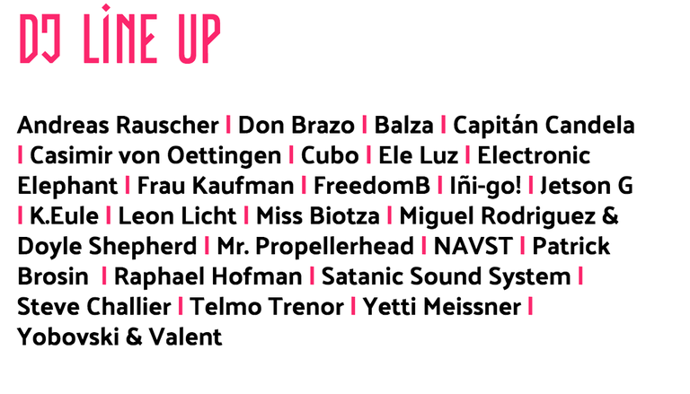 Euskal Herriko zein Alemaniako DJ ezagunak izango dira jaialdian, Andreas Rauscher, Don Brazo, Balza, Capitan Candela, Casimir von Oettingen, Cubo, Ele Luz, Electronic Elephant, Frau Kaufman, FreedomB, Iñi-go!, Jetson G, K.Eule eta Miss Biotza besteak beste. Gainera, Bidelapurrak eta Pelaxen emanaldiak egongo.