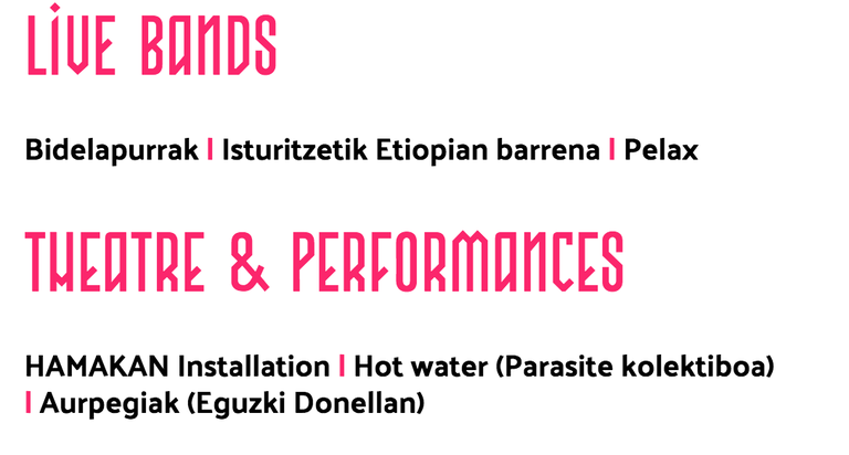 Musikaz gain, bestelako ikuskizunak ere izango dira: Parasite kolektiboaren Hot Water antzezlana eta Marina Suarez Ortiz de Zarateren Hamakan eta Eguzki Donellaren Aurpegiak instalazioak besteak beste.