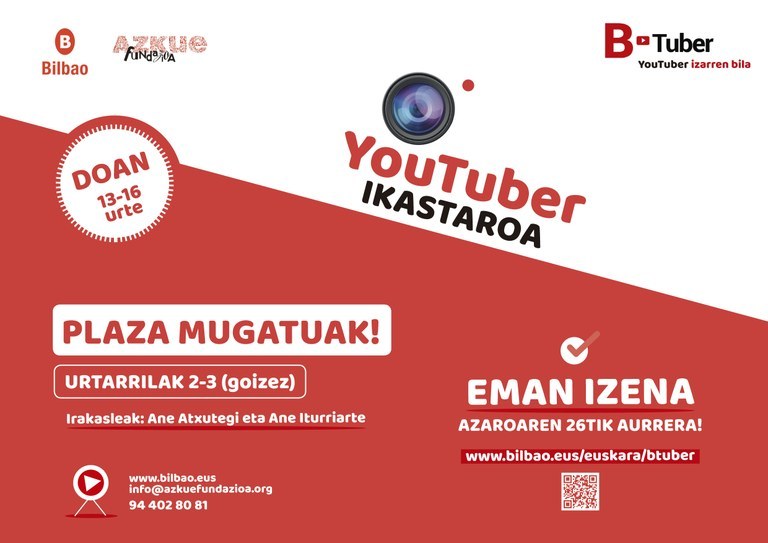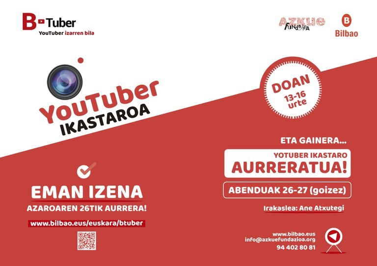 1) YOUTUBER IKASTAROA: Urtarrilak 2-3 (goizez). YouTube plataforma ezagutarazteaz gain, bideoak euskaraz sortzera, editatzera, produzitzera, post-produzitzera animatzea da B-Tuberren helburu nagusia eta horretarako formakuntza saioak eskainiko zaizkizue. Ikastaroaren irakasleak ANE ATXUTEGI eta ANE ITURRIARTE youtuberrak izango dira.