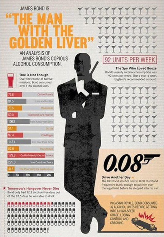 Ikerlariek Ian Fleming-en 14 eleberriak eta ondoren etorritako film guztiak ikertu dituzte, eta ondorioa argia da; 007 agentea erabat alkoholizaturik dago. Zehazki, pertsonaiak aste batean edaten duena gomendatutako kopuru maximoa laukoizten du. Errealitatean, agente honen alkohol kontsumo masiboak bere gorputzeko nerbio sistema erabat suntsituko luke, eta gutxi iraungo luke bere lanpostuan.