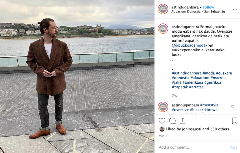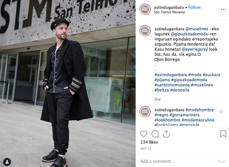 2012an ireki nuen bloga, eta lehiaketa bat ere irabazi nuen, baina konturatu nintzen jendea orokorrean nahiko alferra dela, eta nahiago dituztela argazki gehiago eta testu gutxiago. Horregatik, Instagram plaza egokia zela erabaki nuen, pilula txikiak eskaintzen dituzulako bertan, eta irismen handiagoa lortu daiteke. Ez dut jarraitzale pila lortzeko asmorik, nire helburua euskaraz modaren inguruko kontuak lantzen jarraitzea da. Batzuetan atzerritik idazten didate, egindako post batekin interesaturik, eta jarritakoa itzultzen diet.