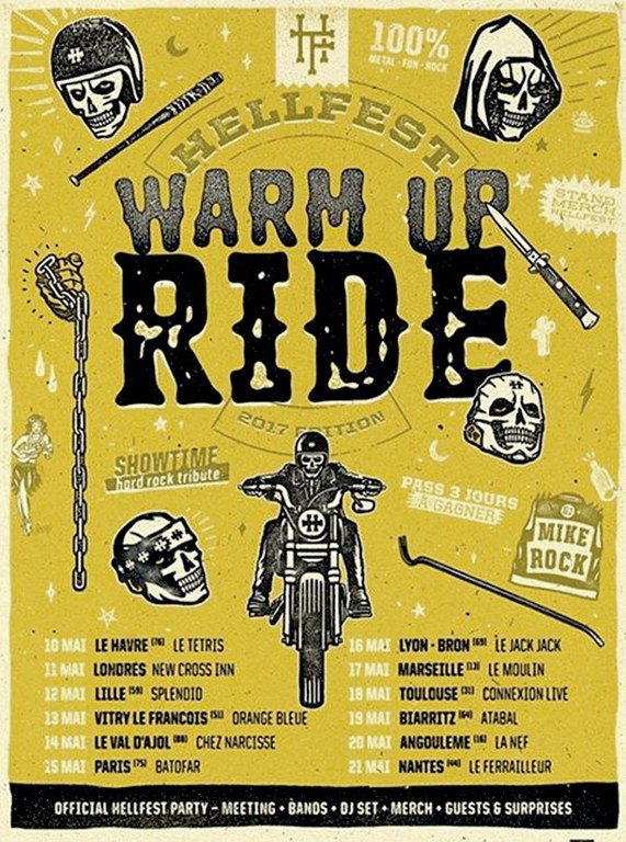 Hemen pare bat proposamen. Maiatzaren 19an gau ederra antolatu dute Miarritzeko Atabalen; Hellfest festibal ezaguna baino lehenagoko asteak berotzeko WARM UP TOUR 2K17: ONE HELL OF A RIDE ekitaldia, anitz bezain ozen, Showtime, DJ Mike Rock, If Renaud Was A Punk, Leather Priest eta Iron Fist taldeekin.