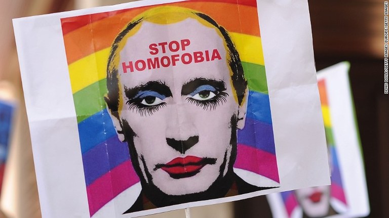 Vladimir Putinen gobernuak homosexualtasuna onargarritzat hartzen duen informazioa santzionatzeko legea onartu zuen 2013an; lege horrek eragindako protestetan jaio zen hain zuzen Errusiako presidentea makilatuta eta ortzadarraren koloreekin apainduta agertzen den irudia. Orain, irudi hori erabiltzea debekatu du gobernuak.