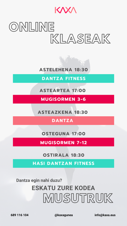 Hala ere, berandu ibili bazara eta klaseren bat galdu baduzu KAXArekin kontaktuan jarri ez gero beharrezko estekak igorriko dizkizute. Beraz, informatu ea zure gustuko zerbait ba ote dagoen KAXAren webgunean edo jarraitu KAXA Instagram bidez eta ez galdu klase bakarrik!