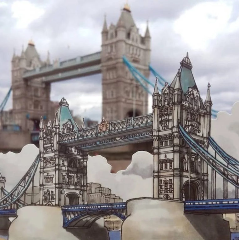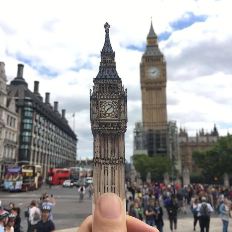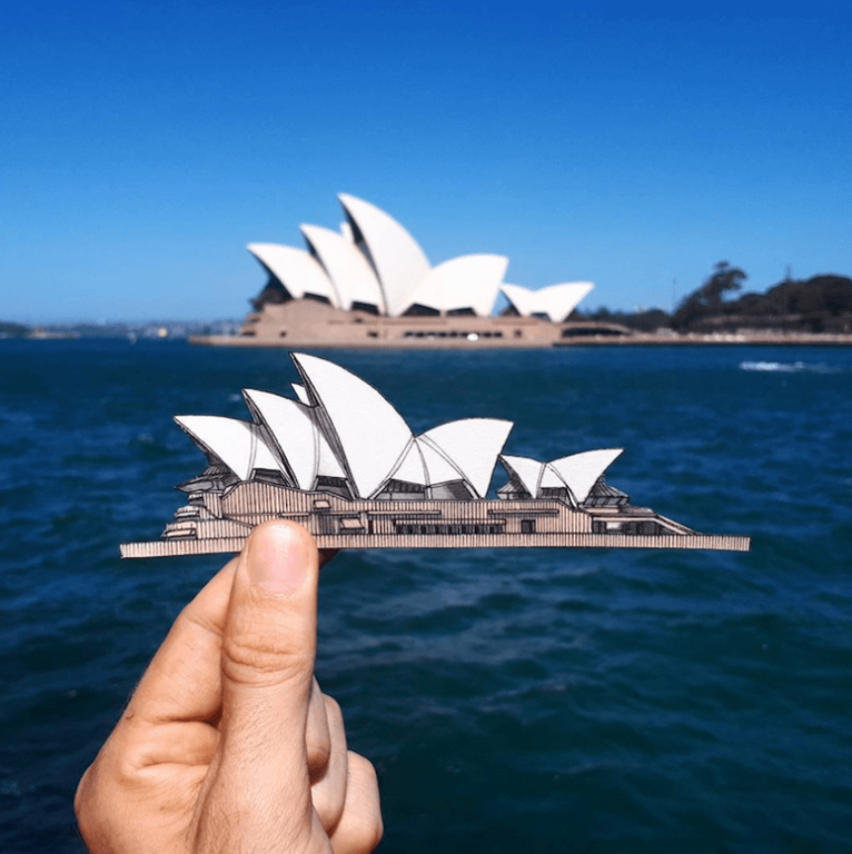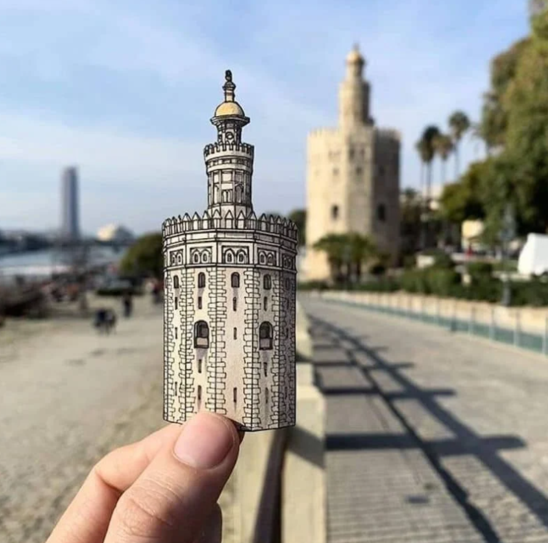 Paperezko ebakigarriek ez dute bost zentimetroko altuera gainditzen baina egokitasun handiz jasotzen ditu tokian tokiko eraikinen ezaugarriak. Gainera, bere marrazkiak eraikinengandik gertu jarri eta argazkia atera ohi du, bien arteko alderaketa egiteko moduan.