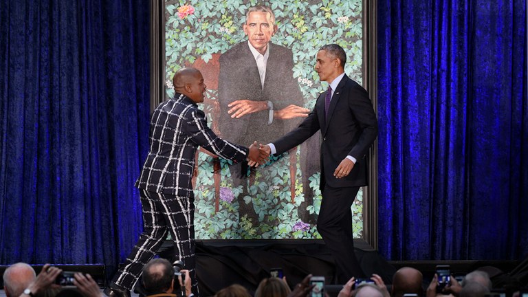 Kehinde Wiley eta Amy Sherald artistak aukeratu dituzte; Wileyk korbata gabe margotu du Barack Obama, lorez betetako oihan batean. Presidente ohiaren esanetan, artista oso fidela izan da: "Belarriak txikitzeko eta ilea ez oso zuri jartzeko eskatu nion, baina ez dit kasurik egin!".