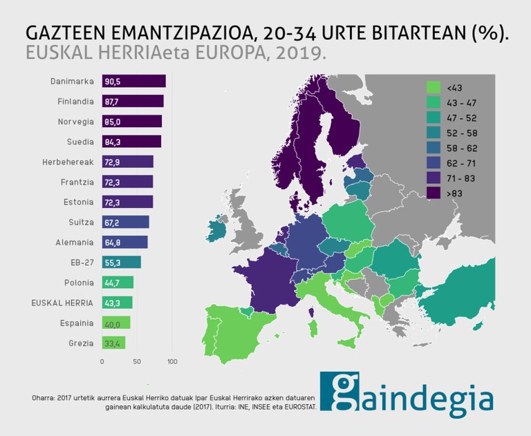 2019. urtean Euskal Herriko 20-34 urte bitarteko gazteen %43,3 gurasoen etxetik kanpo bizi zen. Europar Batasunean proportzio hori %55,3koa zen. Europan gazteen emantzipazio tasa handienak Danimarkan (%90,5), Finlandian (%87,7), Norvegian (%85) eta Suedian (%84,3) izaten dira. Goiz da estatu guztietan 2020 urteko datuak ezagutzeko, baina Danimarkan eta Finlandian, behintzat, gazteen emantzipazioa ez da uzkurtu osasun larrialdiaren ondorioz.