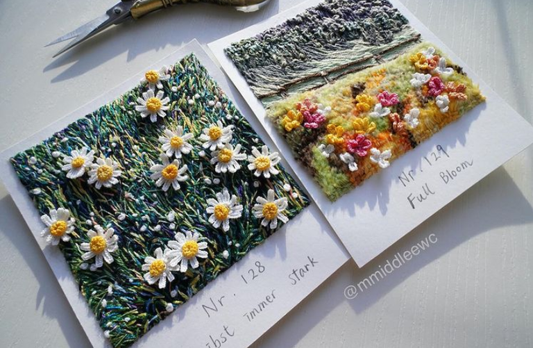 Brodatu teknika ezberdinak erabiltzen ditu, korapiloak eta hari kolore anitzak. Hori dela eta, ikusteko ez ezik, ukitzeko ere balio dute, eskua konposizioaren gainetik pasa eta sentitzeko. Tamaina txikiko pintura-lanen parekoak dira.