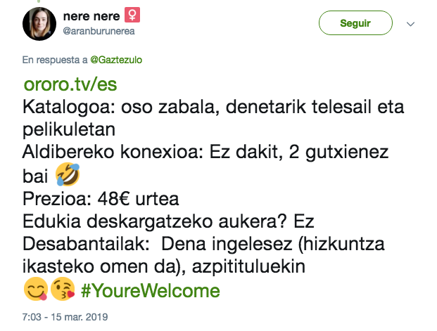 - Desabantailak: Euskarazko edukirik ez eta oso berriak diren izenburuak ikusteko apur bat gehiago ordaindu behar dela.