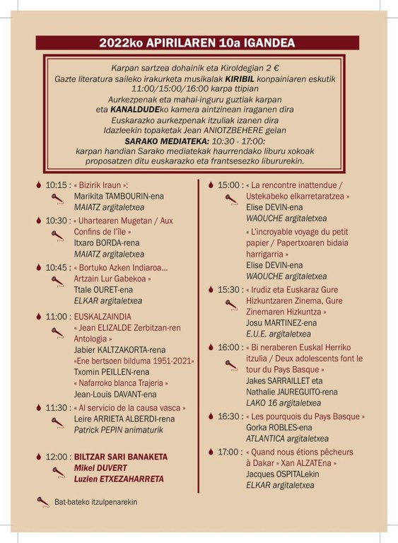 Igandean hainbat hitzaldi eta mahai-inguru izango dira karpan. Marikita Tambourin, Itxaro Borda, Ttale Ouret, Jabier Kaltzakorta, Txomin Peillen, Jean-Louis Davant, eta Leire Arrieta Alberdik euren argitalpenak aurkeztuko dituzte goizean. Eguerdian, Mikel Duvert antropologoak eta Luzien Etxezaharreta idazle eta kazetariak biltzarraren saria jasoko dute. Arratsaldean, Elise Devin, Josu Martinez, Jakes Sarraillet eta Nathalie Jaureguito, Gorka Robles, eta Jacques Ospital arituko dira euren lanez.