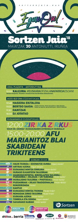 Iganderako planik gabe? Maiatzaren 20an, euskarazko eskola publikoaren aldeko Sortzen jaia ospatuko dute Iruñean, Antoniutti parkean. EgunOn! izango da aurtengo leloa, euskarak eguneko lehen hitzetik duen garrantzia nabarmenduz.