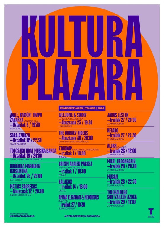 Uztailaren 5etik irailaren 29ra bitarte musika, antzerkia, dantza, literatura, zinea edota haurrentzako ekintzak izango dira Tolosan, gehienak kalean, kulturaz plazan gozatze aldera.