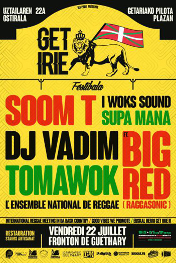 GETARIA, LAPURDI: Uztailaren 22an,ostirala, GET IRIE festibala antolatu du Iparraldeko PROD. – IPK taldeak; etahonako musika taldeen lanaz gozatzeko aukera izango duzu frontoian, 18:00etatikaurrera: NAÂMAN & FATBABS, MASSY THE CREATOR, TRIPLE, PAPA STYLE, DIYSOUND, ROOTS ZOMBIE, KULTO KULTIBO, BIDADA SOUND.