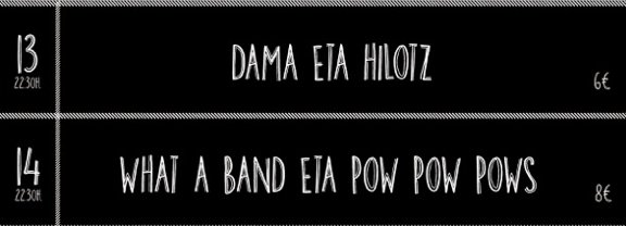 Indartsu hasi du urtea Bonbereneak; hilak 13eta 14, ostiral eta larunbata, kontzertu bikoitzaz gozatzeko aukera izangoduzu; lehenik Dama eta Hilotz taldeak eta ondoren What a Band eta Pow, Pow,Pows taldeak ariko dira. Biak 22:30etan, sarrera 8 eurotan.