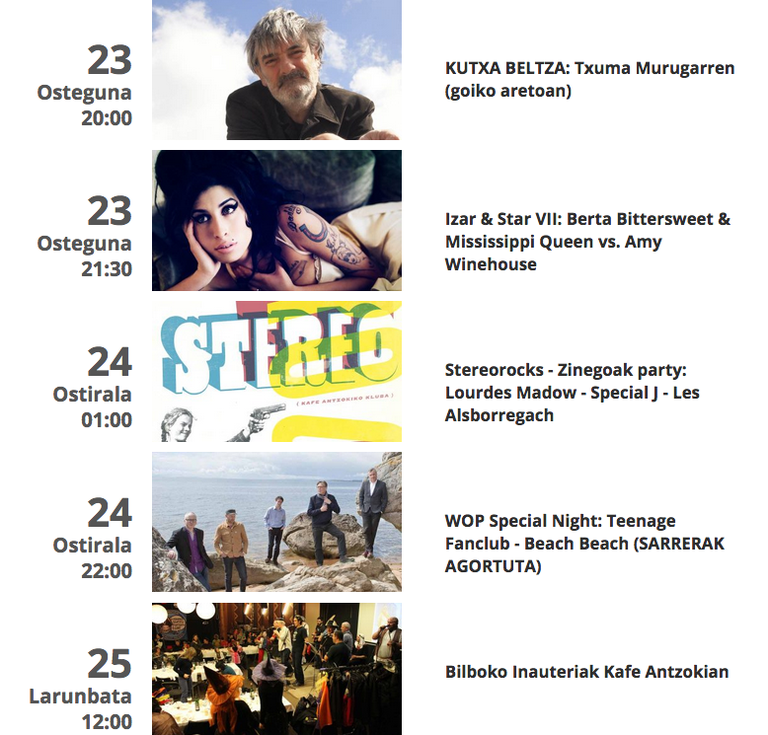 Gustu guztientzako planak antolatu ditu Kafe Antzokiak asteburu honetan. Ostegunean, hilak 23, Txuma Murugarren goiko aretoan izango da, 20:00etan. IZAR & STAR VII: BERTA BITTERSWEET & MISSISSIPPI QUEEN vs. AMY WINEHOUSE sekulako emanaldiaz gozatzeko aukera duzu. Larunbatean, hilak 24, ez galdu ZINEGOAK jaialdiak antolatu duen festa! Eta mozorroa soinean jarri beharko duzu igandean, hilak 25, inauteri festan primeran pasa nahi baduzu.