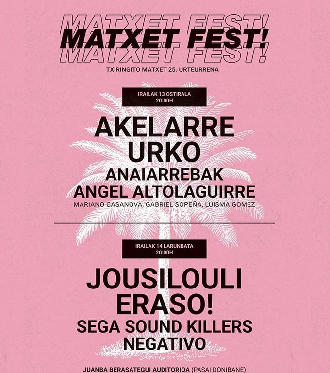 Irailaren 13 eta 14 arratsean Matxet Fest jaialdia ospatuko da Pasai Donibaneko Juanba Berasategi Auditoriumean. Ostiral eta larunbatez burutuko dira zuzenekoak eta gauero lau musika proposamen taularatuko dira. Emanaldi bakoitzak 30 minutuko saioak izango dira. Musika egitaru anitza eta koloretsua prestatu dute bi egunetarako. Ikusmina sortu du Jousilouli talde mitikoaren aitzakiak eta horregatik larunbaterako sarrera guztiak agortu dira.