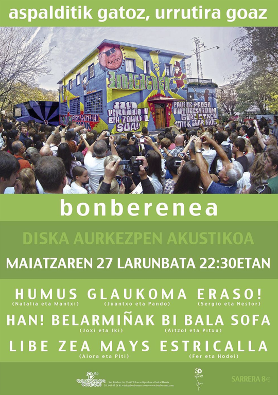 Maitzak 27, larunbata, 22:30etan, Bonberenea "Aspalditik gatoz, urrutira goaz" bildumaren aurkezpena izango da akustikoan. Aurkezpen kontzetuan talde hauek parte artuko dute, Humus (Natalia eta Mantxi) Glaukoma (Juantxo eta Pando), Eraso! (Sergio eta Nestor), Han!, Belarmiñak (Joxi eta Iki), Bi Bala (Aitzol eta Pitxu), Libe, Zea Mays (Aiora eta Pitti), Estricalla (Fer eta (Hodei). Ez galdu!