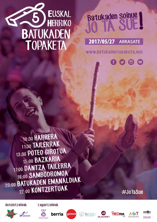 Ufa! Hau da festa! Hemen da Euskal Herriko Batukaden 5. Topaketa! Aurtengo edizioa, 2017ko maiatzaren 27an izango da Arrasaten. Aurrekoa Zornotzan izan zen, 2016ko maiatzaren 21ean; Zaparrada eta Dinbi Banda batukadek antolatutako egunaren kartel ofiziala eta bideo laburpena dituzue hemen. 200 bat lagunek pate hartu zuten modu aktiboan gure topaketan. Informazio guztia hemen topatuko duzue. Batukaden soinue, jo ta sue!