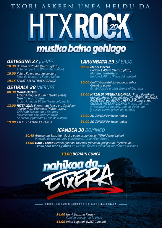 Hatortxu Rock jaialdiaren 20. edizioari hasiera emango diote ostegunean, hilak 27, eta 30ean, igandea amaituko dute. Lau egunez kontzertuak, mendi martxak eta hitzaldiz betetako egitaraua martxan jarriko dute. Hatortxu Rock elkartasun jaialdi bat da, desagertzeko sortu zena. Hasieratik euskal preso, iheslari, errefuxiatu eta hauen guztien senideei elkartasuna adierazi diete etengabean.