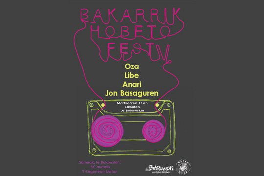 Donostiako Le Bukowski tabernak Bakarrik Hobeto Fest jaialdiaren 5. ekitaldia hartuko du martxoaren 11n. Ohi bezala, bakarlariak izango dira taula gainean ariko direnak, eta izen ezagunez beteriko egitaraua osatu dute aurten. Izan ere, Anari, Jon Basaguren (Izaki Gardenak), Libe eta Iñigo Ozaeta Oza gonbidatu dituzte antolatzaileek.