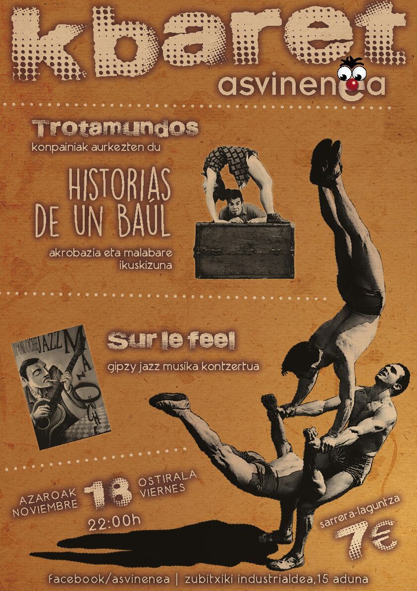 Asvineneako Kbaretak ikuskizun harrigarriaprestatu du ostiralerako, hilak 18. Trotamundos taldearen eskutiz, akrobaziazeta malabarez betetako ‘Historias de un baúl’ eta Sur le feel taldearen gipsyjazz musika emanaldiak ikusteko aukera izango duzu Adunako Poligono Zubitxikin.Informazio gehiago hemen.