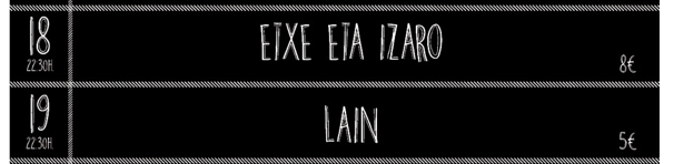 Plan polita duzu ostiral eta larunbat gauerakoTolosako Bonberenean. Ostiralean, hilak 18, Etxe eta Izaro entzuteko aukeraduzu, 22:30ean, 8 euroren truke. Larunbatean aldiz, hilak 19, Lain izango duzuzuzenean, ordu berean, 5 euroren truke. Ondo pasa!