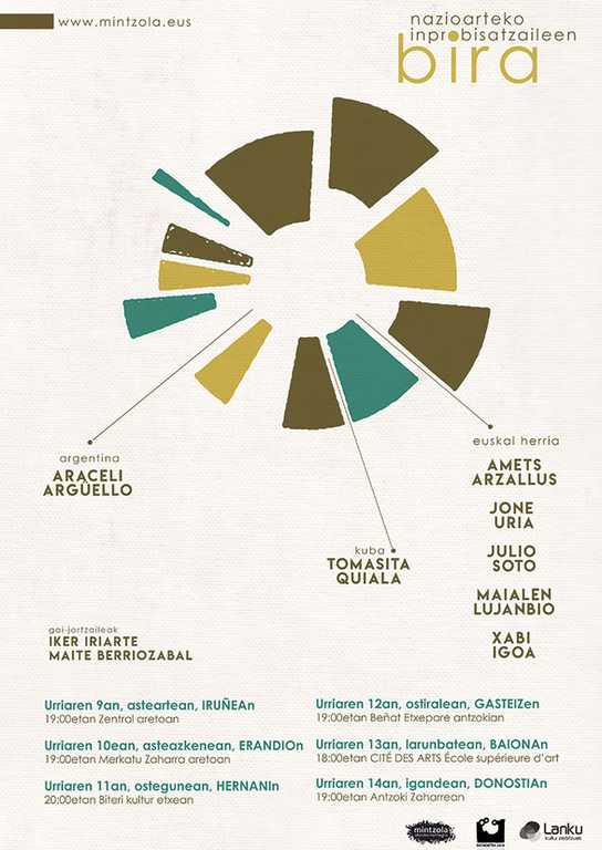 Urriaren 9tik 14ra gauzatuko den bira izango da, Iruñean hasita, egunero emanaldi bat eskainiz: Erandio, Hernani, Gasteiz, Baiona eta Donostia izango ditu jomuga. Kubako Tomasita Quiala repentistak, Araceli Argüello Argentinako payadoreak eta Amets Arzallus, Jone Uria, Julio Soto, Maialen Lujanbio eta Xabi Igoa bertsolariek hartuko dute parte biran. Zeren zain zaude EGITARAUA ezagutzeko?