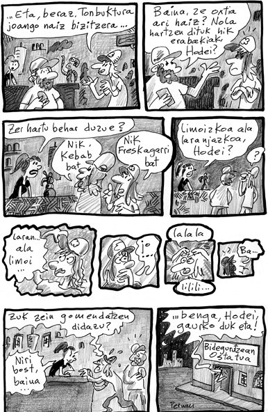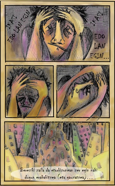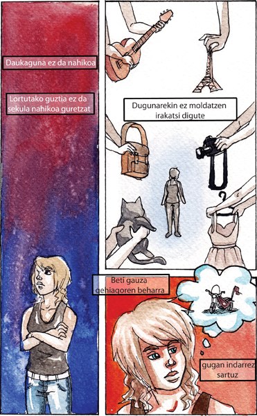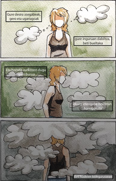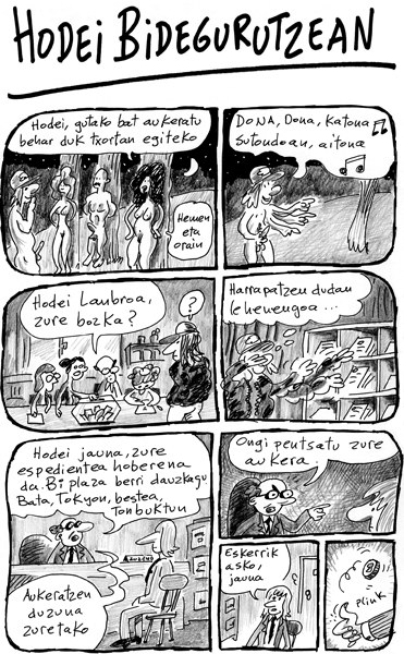 Gai bakarra eta anbiguoa jarri diegu lau komikigileri, nork nahiago duen amaiera eman diezaion guk hasitako horri: Hodei bidegurutzean. Irudimena eta margoak dantzara atera dituzte, hurrenez hurren, Pernan Goñik, Ane Arzelusek, Alai Zubimendik eta Oihane Sanchezek, beste mugarik gabe. Emaitza, datozen orrietan.