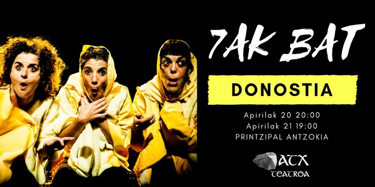 Apirilaren 21ean, igandea, Donostiako Antzoki Zaharrean ATX Teatroak 7AK BATkomedia-satiriko-feminista eskainiko du. Gizakiaren gaiztakeriaren inguruko komedia hau antzezlan garaikidea da, euskaraz eta publiko gazte-helduari zuzendua. Aiora Sedano, Miriam K Martxante eta Estibaliz Villa topatuko dituzue taula gainean.