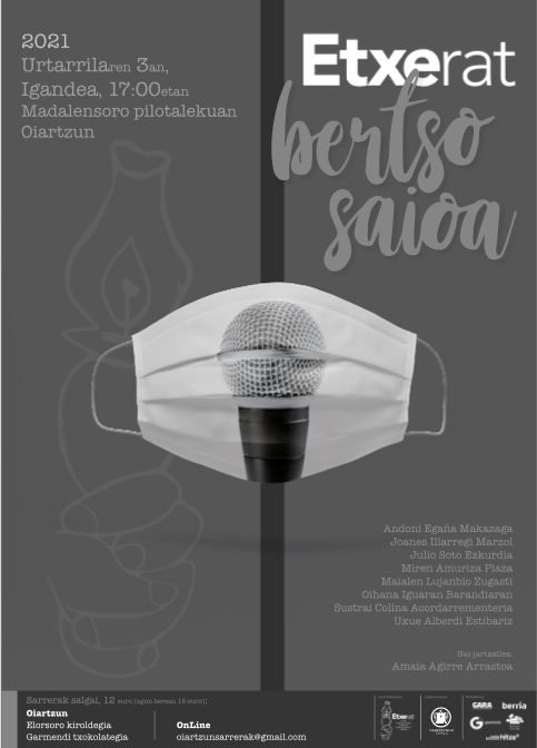 17:00etik aurrera puntako bertsolariak igoko dira oholtza gainera: Andoni Egaña, Maialen Lujanbio, Julio Soto, Joanes Illarregi, Miren Amuriza, Oihana Iguaran, Sustrai Colina eta Uxue Alberdi; gai jartzaile lanetan Amaia Agirre ariko da.